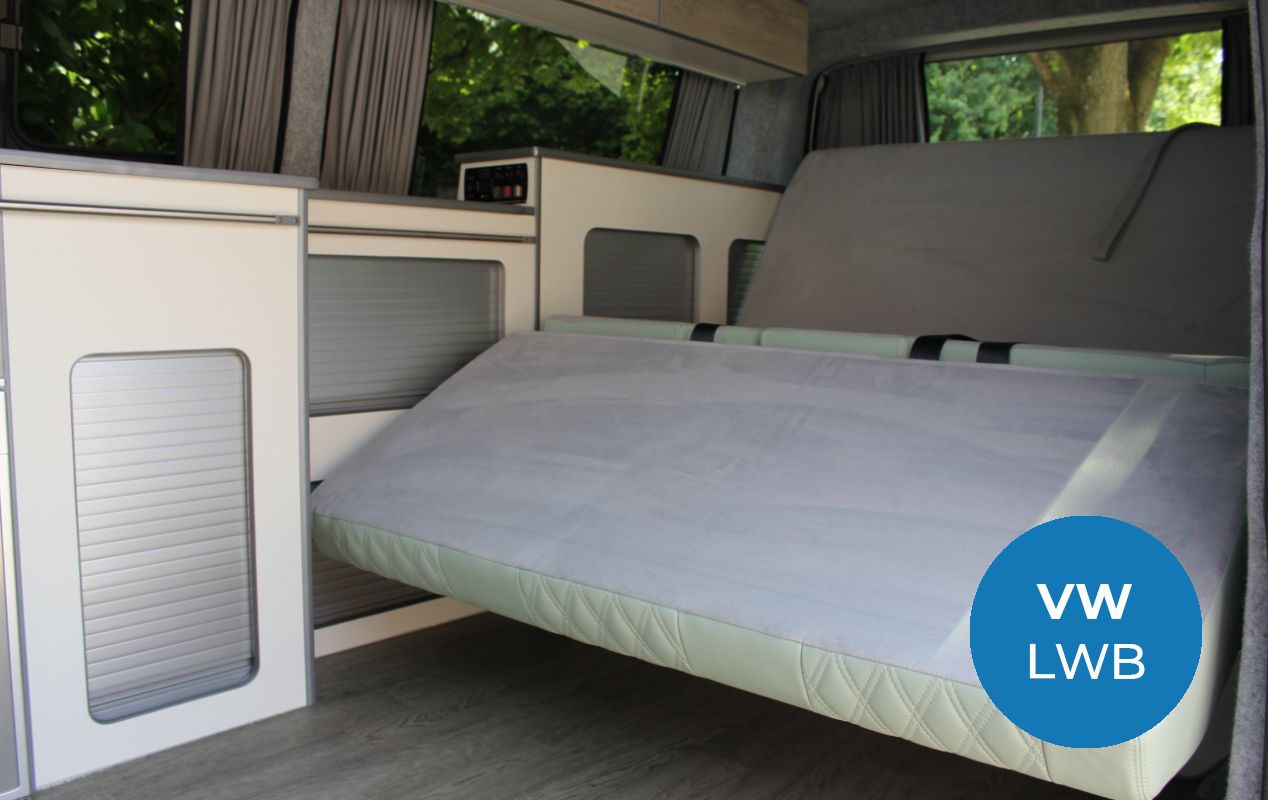 Our Brierywood camper conversion layout boasts a larger premium M1 tested 3-seater 129 RIB Altair bed system with an integrated slider and headrests, as standard, designed in response to a growing demand for a larger sleeping space and up to six travelling seats.